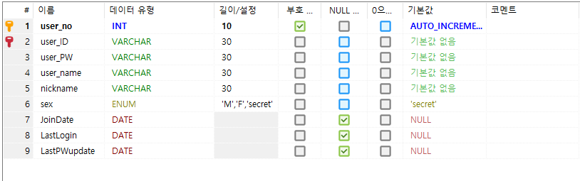 현재 user 테이블
